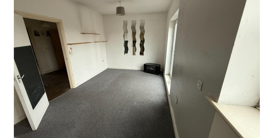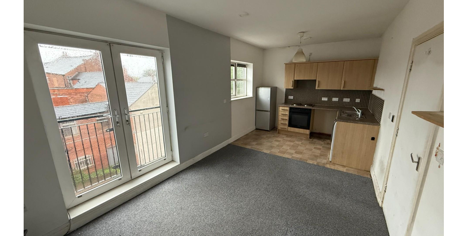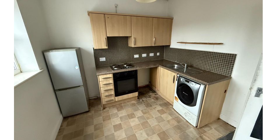 Open-plan lounge/kitchen with Juliet balcony-style doors Two bedrooms (one double, one single) Bathroom with white suite Entrance hall with storage cupboard Council Tax Band A; EPC rating C Scope to modernise throughout – strong rental or resale prospects once improved.